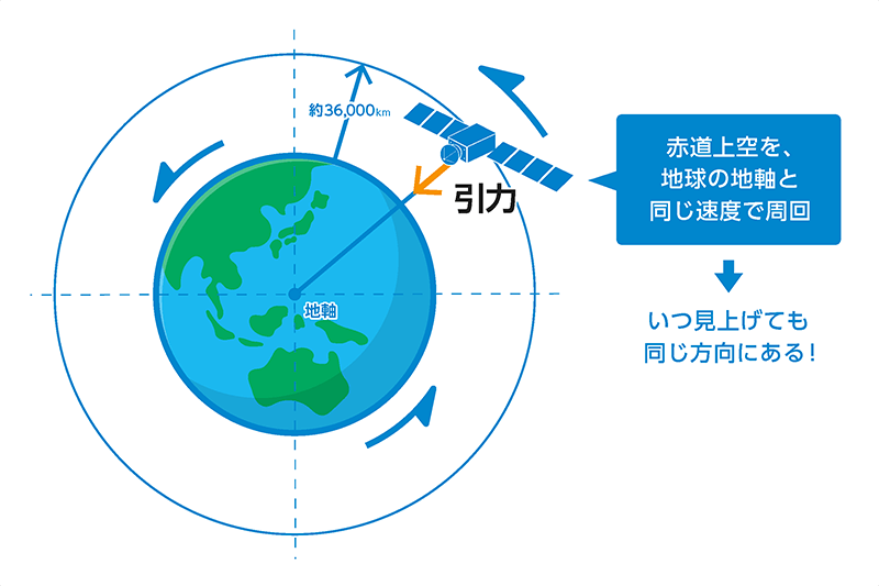 静止軌道は、特定のエリアを常に24時間365日安定して観測することができるため、いつも特定のエリアに電波を届けたいテレビ放送や、常に日本の上空の気象を観察したい天気予報に便利です。それらの衛星はそれぞれ「放送衛星」や「気象衛星」と呼ばれます。